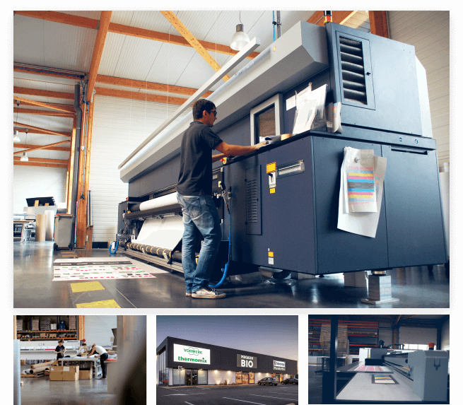 Nous disposons d’un parc de 10 machines numériques de dernière génération permettant d’imprimer à la fois sur support souple et rigide, qu’ils soient de petits ou grands formats (5 mètres de largeur), pour le monde de l’enseigne, de la publicité et de la décoration.